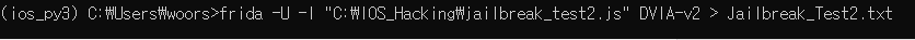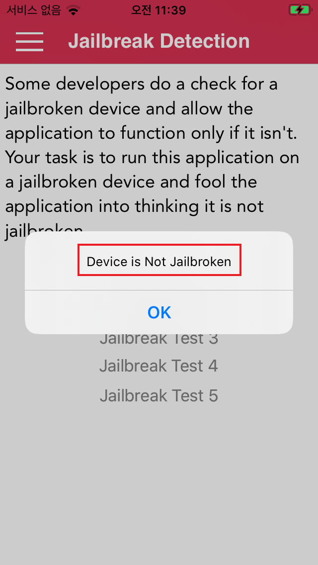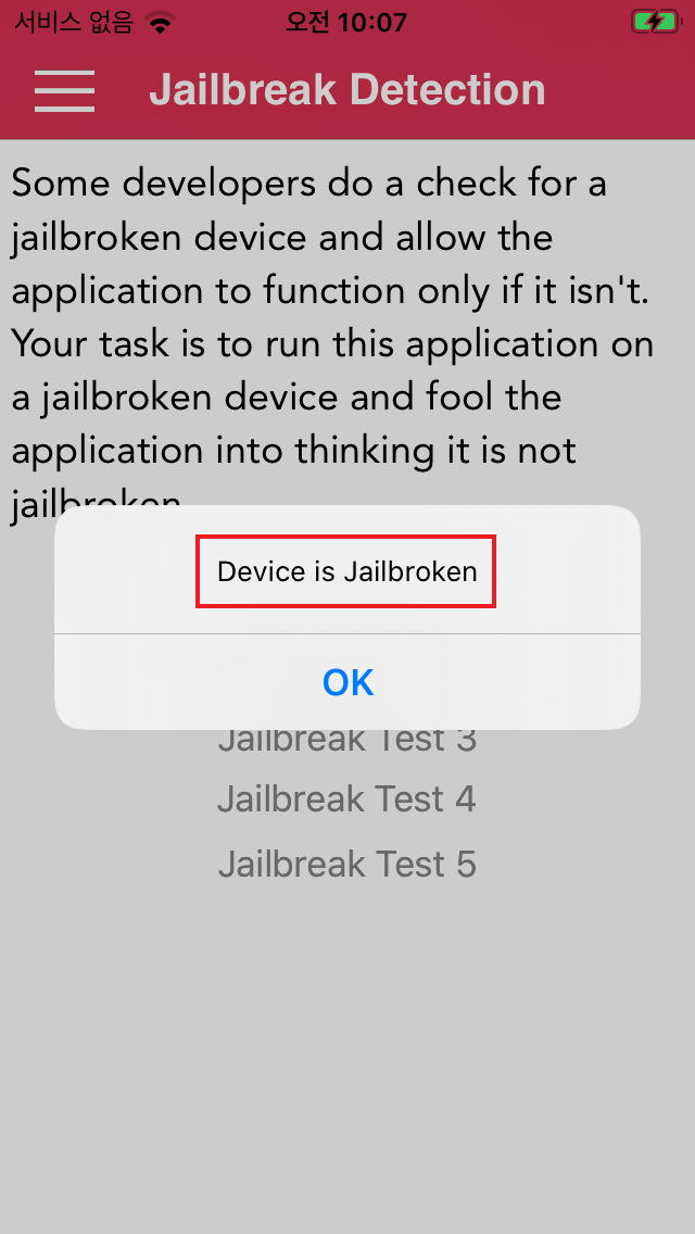 Jailbreak Test 2번 클릭시 탈옥 탐지 문자열 출력 확인