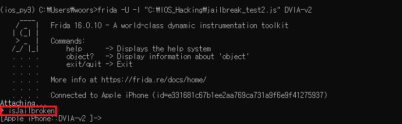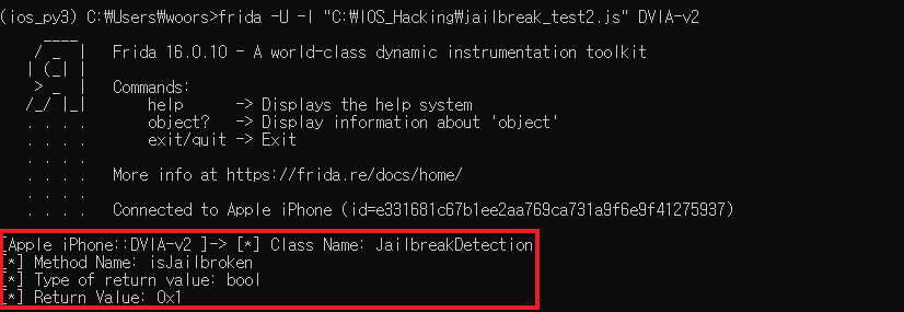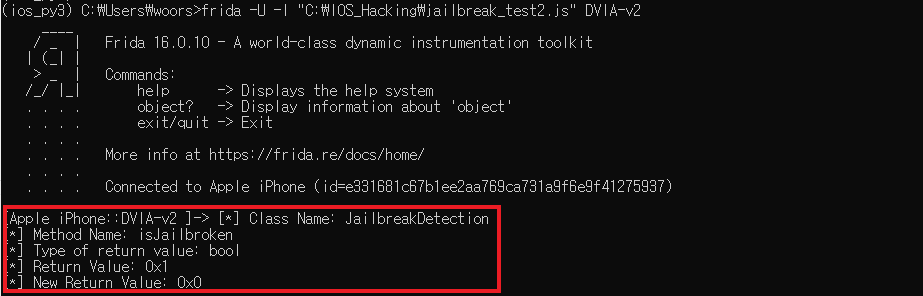 js코드를 실행 후 앱에서 Jailbreak Test 2 를 클릭 시 정보가 출력되며 리턴 값을 0으로 변조하면 탈옥 탐지 우회가 가능(현재 리턴 값은 1)