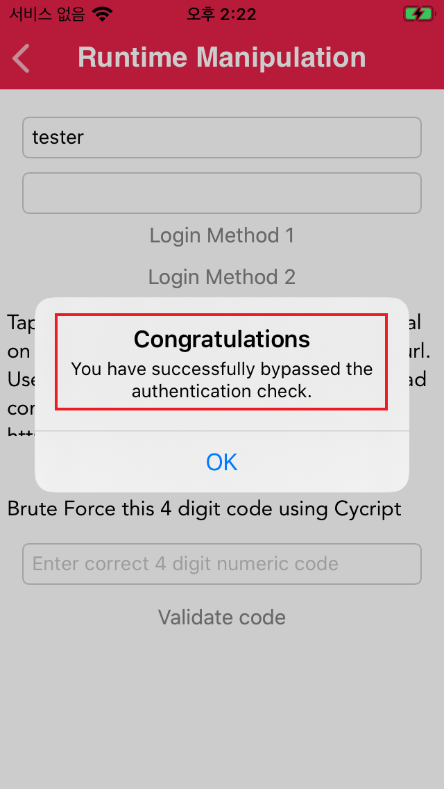 - 런타임 조작을 사용해 인스턴스 변수를 수정하고, 로컬 로그인 검사를 우회하고, 무차별 강제 핀 코드를 사용 가능