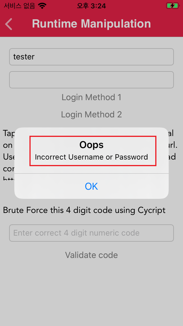 Login Method 2 클릭 시 계정정보가 불일치한다는 메시지 출력
