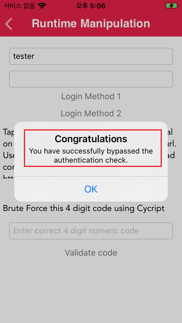 레지스터 값 변조 후 Login Method 2 버튼을 클릭 시 인증 우회 성공 메시지 출력