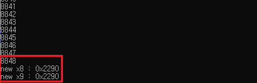 위의 코드를 실행시키면 x8에는 16진수 2290이 x9에는 16진수 457이라는 값이 들어가 있는 것을 확인
