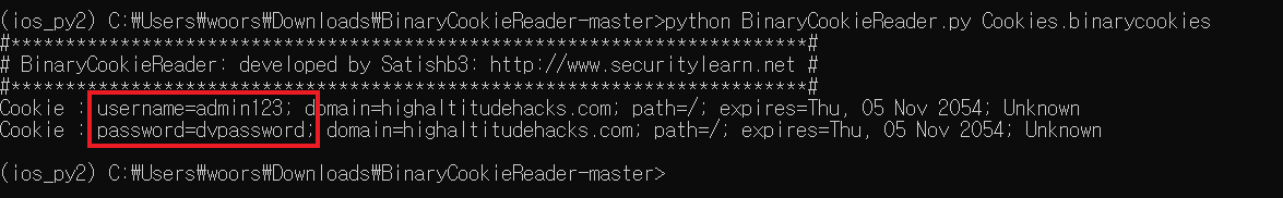 저장된 쿠키값을 확인 가능하며 username password가 출력되는 것을 확인