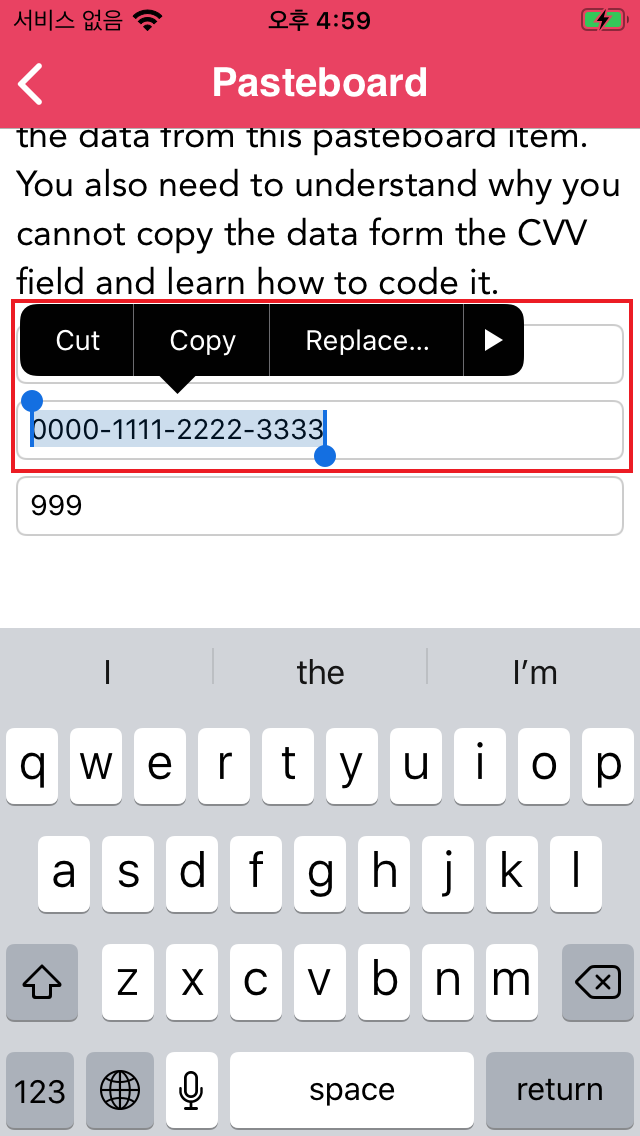 - 복사한 중요한 텍스트가 Pasteboard에 포함되어 있으면 다른 애플리케이션에서 가져와 데이터 유출이 가능