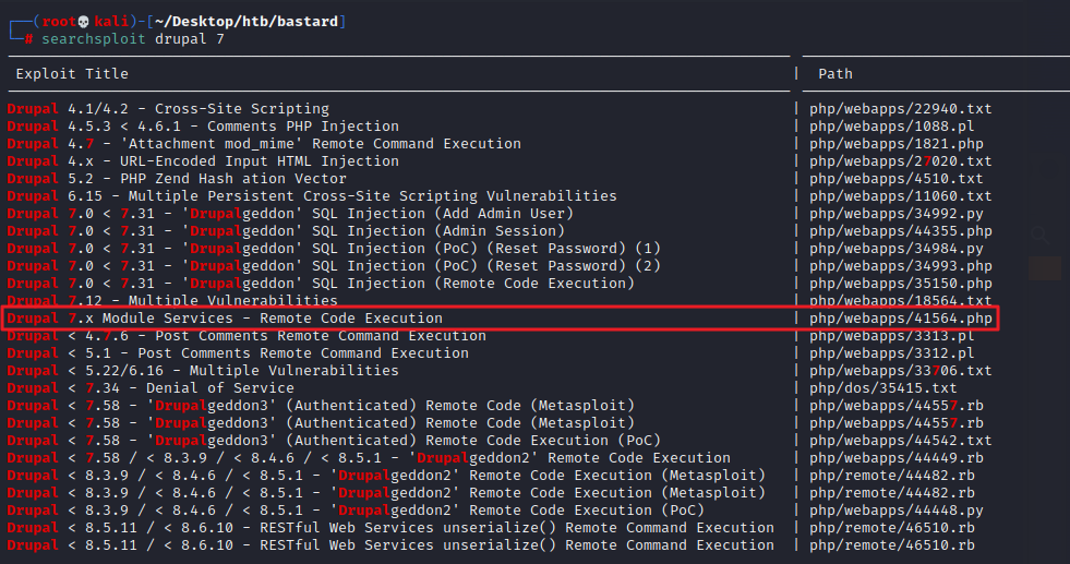 drupal exploit 검색 후 41564 익스플로잇 가져옴(다른 RCE 익스플로잇으로도 가능)
